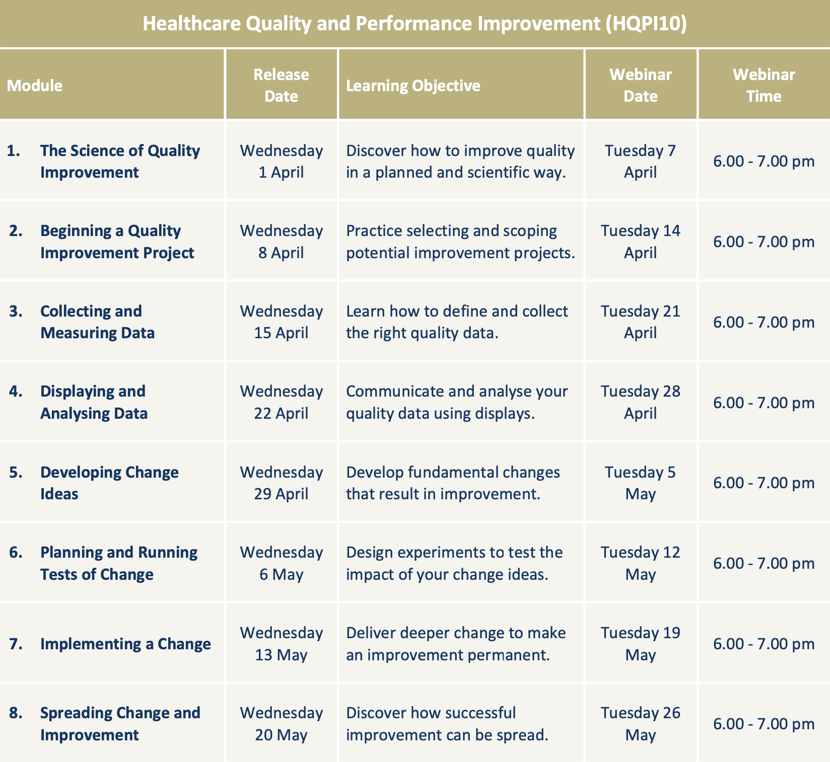We believe that quality improvement skills are just as important for healthcare professionals as an understanding of anatomy and physiology. So this course truly is for everyone – whether they work in a clinical or administrative role – who wants a solid foundation in quality improvement concepts, methods and tools that can be used every day. It is also an ideal course for established quality improvement specialists who want to update and expand their knowledge and is very suitable for staff who are aspiring to, or preparing for, a future quality specialist role.